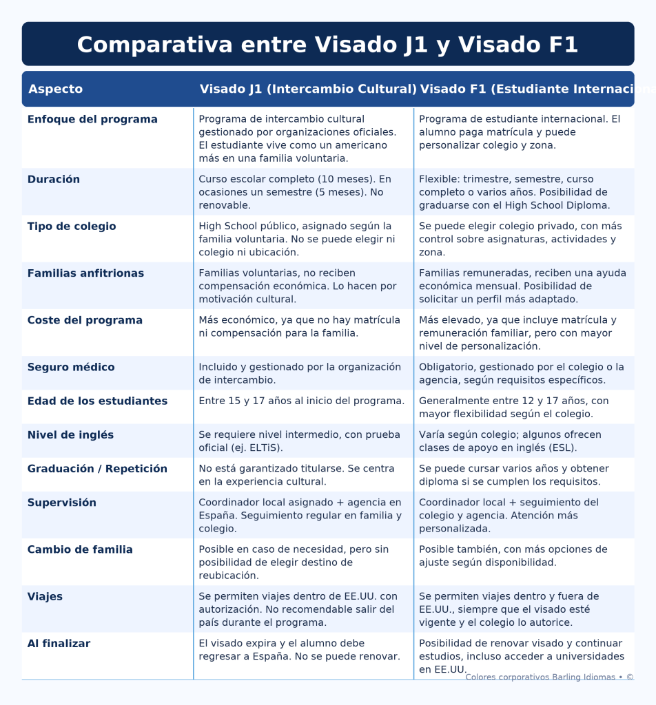 Antes de elegir el programa, es fundamental conocer las diferencias entre el visado J1 (intercambio cultural) y el visado F1 (estudiante internacional). Ambos ofrecen oportunidades increíbles, aunque varían en duración, tipo de colegio, posibilidades de graduación o precio.